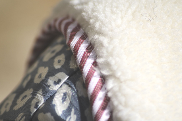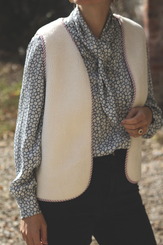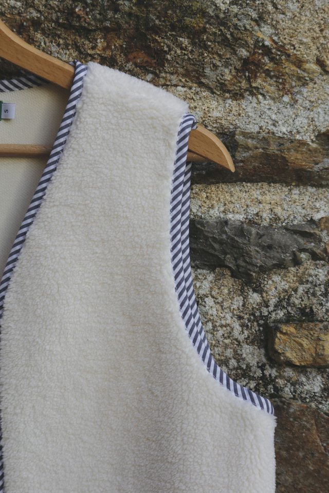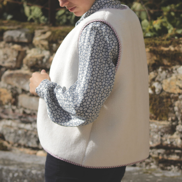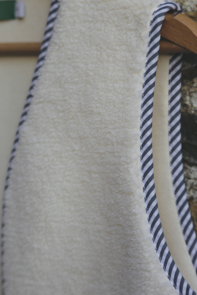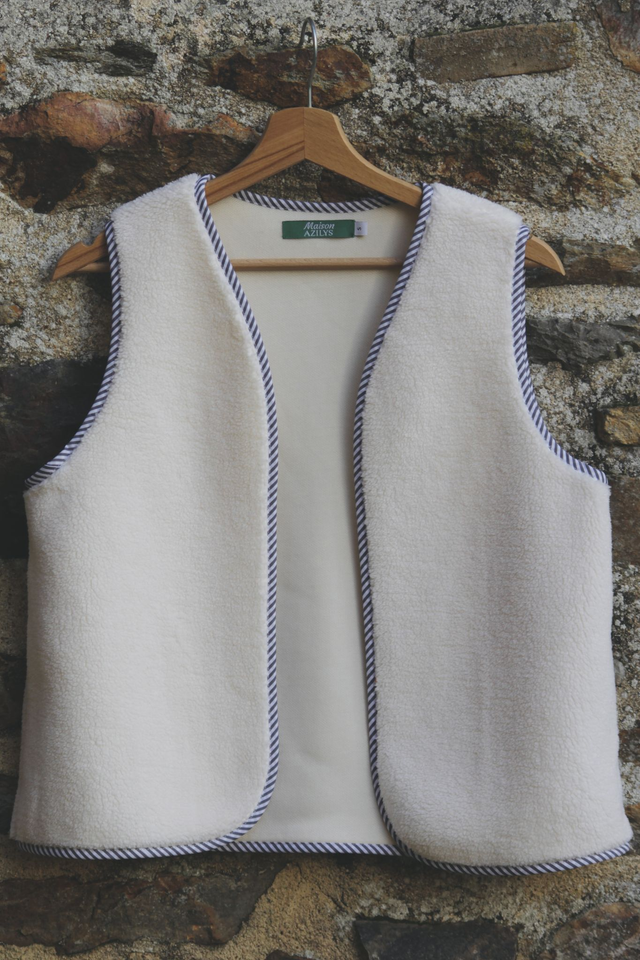 Ambroise est un gilet berger en moumoute blanche bordé d’un biais rayé bordeaux. C’est le gilet parfait pour allier élégance et simplicité !